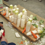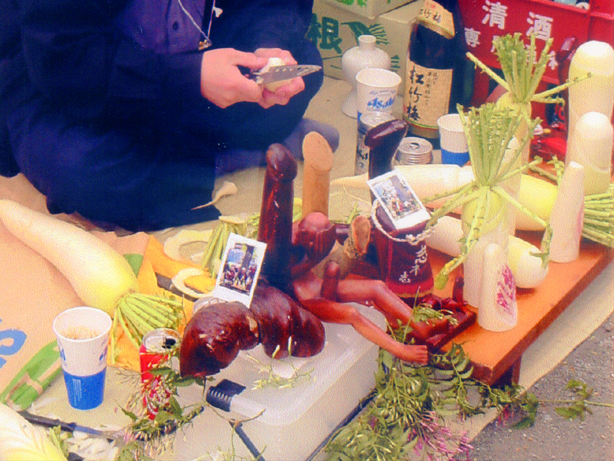 境内の真ん中辺りの樹木の下に茣蓙を敷いて、奉納用に大根を男根型に掘るコーナーも設置されているんだけど、こういうのに積極的に参加していたのがかつては外人さんばっかりだったけど、