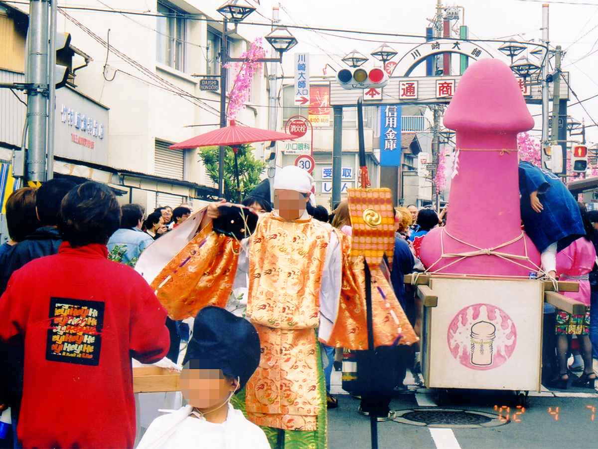「金山神社」という名前は全国に散見できますが、これは概ね明治の初期に「かなまら神社」が時の政府から改名を迫られたものです。 「かなまら」の「まら」は、当然「麻羅(まら) = チンポ」。 風紀上よろしくないというわけです。 九重京司さんの著書によると、この頃の栃木県羽黒町の「チンコ八幡」が「鎮国八幡」になども、やはりその頃に神号・社号変更を迫られたものではないかとのことです。 もっとも、金山神社の多くはあまり金属とは関係ないものみたいなんですが、ここ川崎の金山神社は祭神が金山毘古神と金山毘売神であり、金属を神格化したものですからそんなに文句いうほど的外れだったわけではないのかも知れません。 刀鍛冶師が尊奉するフイゴの神であって、火をおこすフイゴのピストン運動が男女の交接を連想させる。 それがいつしか、神前に奉献された金属製の男根が祭神の座について「かなまらさま」と崇められるようになったわけですから、まあ残念は残念ですけどそれほど的外れな命名でもなかったのかも知れません。 川崎製鉄が金属製のチンポ神輿を寄進したりしたのも、頷けるというもの。
